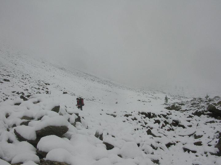 condizioni tardo autunnali: si pestava neve dopo il lago di s. bernolfo (manto continuo) che aumentava fino ai 30 e addirittura 40 cm e più negli accumuli sotto la vetta. prima parte veramente noiosa: la mulattiera non sale mai…, e avendo pressoché visibilità quasi nulla.. è stato abbastanza un esercizio di pazienza, mitigato solo dall’ambiente invernale. arrivati al lago di collalunga sul pendio che conduce il passo abbiamo trovato discreti e faticosi… accumuli di neve farinosa asciutta; dal colle in poi la visibilità era pessima, quindi non sono sicuro se abbiamo raggiunto la cima ovest, ma confrontando le varie relazioni di gulliver,mi sembra di sì: comunque abbiamo tenuto il filo della cresta ovest dell’autaret intercettando una mulattiera, sepolta dalla neve, finché abbiamo incontrato un restringimento e impennata dalla cresta che in caso di assenza di neve-ghiaccio è banale, con le condizioni di ieri era decisamente ee…, nulla di che, ma da prestare attenzione per una lieve esposizione sui canali dell’autaret, e in breve dopo le roccette innevate siamo giunti a una cima con casermetta-bunker: l’altimetro dava la quota della cima ovest, ma la scarsissima visibilità non ha permesso di assicurarcene. discesa veloce sotto una lieve bufera e ultima parte sotto la pioggia prima di s. bernolfo con limite neve che si stava rapidamente alzando.