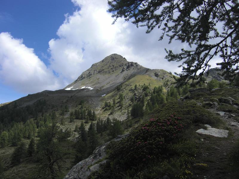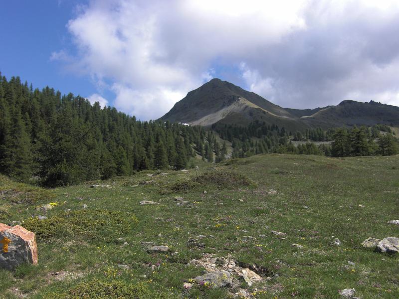 Abbandonare il sentiero n°6 e proseguire lungo un valloncello (sentiero n°4) in direzione N-E quindi deviare a sinistra e, salendo attraverso il bosco di larici, raggiungere la cresta che porta alla vetta (a sinistra sentiero che percorreremo al ritorno).