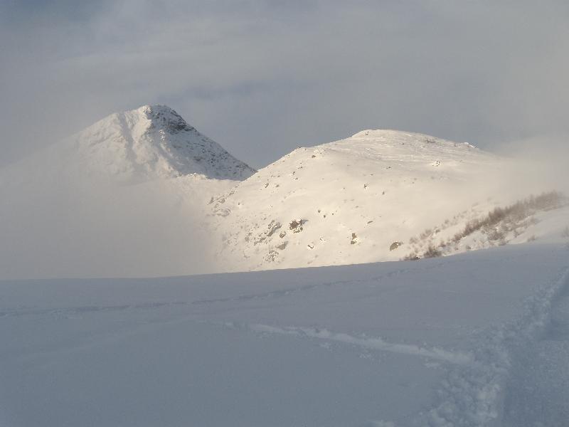 La discesa si puo’ effettuare lungo la traccia di salita o tenendosi leggermente piu’ a sinistra per cercare qualche pendenza. (fonte Lorenzo - Glucai)