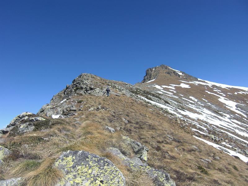 Si deve percorrere tutta la cresta sud della nostra montagna. Inizialmente la cresta e’ erbosa e le tracce di sentiero (tacche bianco/rosso) si snodano sul versante chisone.