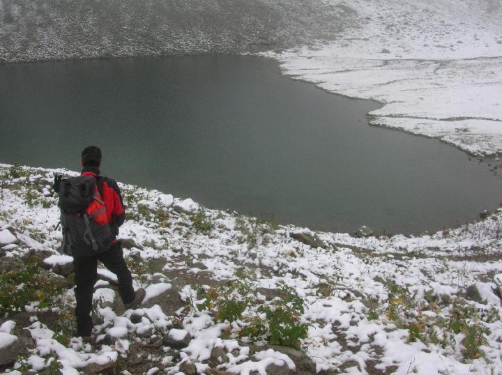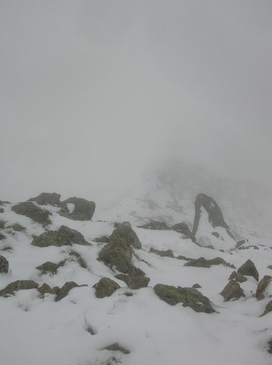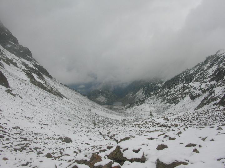 condizioni tardo autunnali: si pestava neve dopo il lago di s. bernolfo (manto continuo) che aumentava fino ai 30 e addirittura 40 cm e più negli accumuli sotto la vetta. prima parte veramente noiosa: la mulattiera non sale mai…, e avendo pressoché visibilità quasi nulla.. è stato abbastanza un esercizio di pazienza, mitigato solo dall’ambiente invernale. arrivati al lago di collalunga sul pendio che conduce il passo abbiamo trovato discreti e faticosi… accumuli di neve farinosa asciutta; dal colle in poi la visibilità era pessima, quindi non sono sicuro se abbiamo raggiunto la cima ovest, ma confrontando le varie relazioni di gulliver,mi sembra di sì: comunque abbiamo tenuto il filo della cresta ovest dell’autaret intercettando una mulattiera, sepolta dalla neve, finché abbiamo incontrato un restringimento e impennata dalla cresta che in caso di assenza di neve-ghiaccio è banale, con le condizioni di ieri era decisamente ee…, nulla di che, ma da prestare attenzione per una lieve esposizione sui canali dell’autaret, e in breve dopo le roccette innevate siamo giunti a una cima con casermetta-bunker: l’altimetro dava la quota della cima ovest, ma la scarsissima visibilità non ha permesso di assicurarcene. discesa veloce sotto una lieve bufera e ultima parte sotto la pioggia prima di s. bernolfo con limite neve che si stava rapidamente alzando.