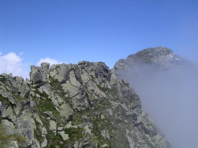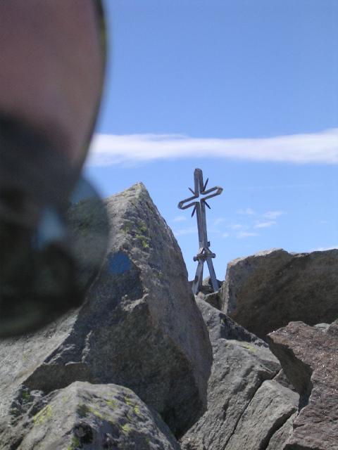 Dalla vetta si prosegue in direzione est (bolli azzurri e rosso sbiadito, sentiero D23) e si ridiscende la cresta sud est attraverso qualche roccetta attrezzata e ripido sentiero fino a riguadagnare una sorta di antecima (canaponi), la si risale, e si ridiscende perdendo quota meno rapidamente e con lungo traverso fino a una sorta di ampio pianoro (nevai a inzio stagione). Attraversatolo con una leggera risalita si guadagna la caratteristica zona di rocce montonate che portano alla conca del Lago del Monte Rosso alla vostra dx, da qua si scende in direzione sud-est fino al bivio della cappella degli Alpini. (fonte www.gulliver.it)