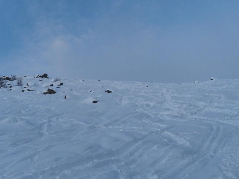 La discesa si puo’ effettuare lungo la traccia di salita o tenendosi leggermente piu’ a sinistra per cercare qualche pendenza. (fonte Lorenzo - Glucai)